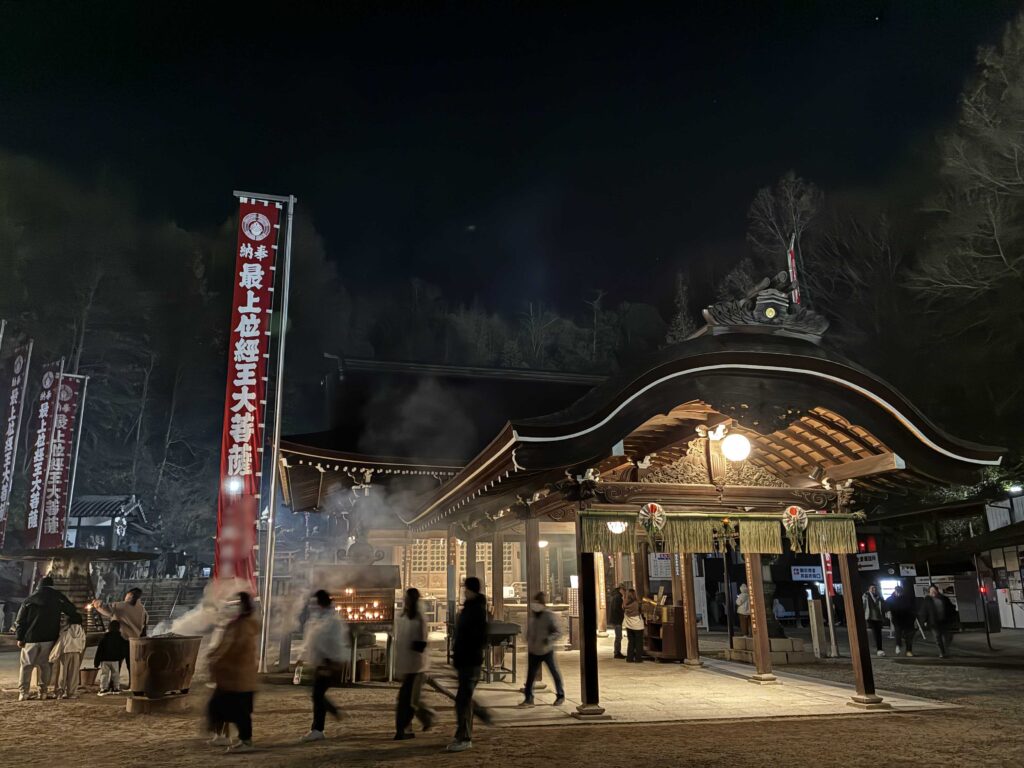 深夜3時を過ぎた頃の旧本殿周辺は、本殿周辺とは違って人影もまばらでした。0時過ぎには連なっていたおみくじの行列もほぼなくなり、静けさと冴えた空気の清らかさに満ちた独特の気配が漂います。混雑する印象の最上稲荷の初詣ですが、三が日でも深夜、早朝は比較的静かにお参りできるので、時にはこうした時間に訪れるのもおすすめです。