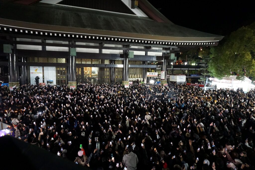 大晦日の夜の岡山市は気温1.6度と昨年より冷え込みましたが、境内は年明けの瞬間を最上稲荷で迎えようと訪れた大勢の参拝者の熱気に満ちあふれました。0時数秒前、どこからともなく始まるカウントダウンのかけ声。そして年が明けたその瞬間、集った人々の歓声に包まれた境内は、新たな年への決意と期待に包まれました。