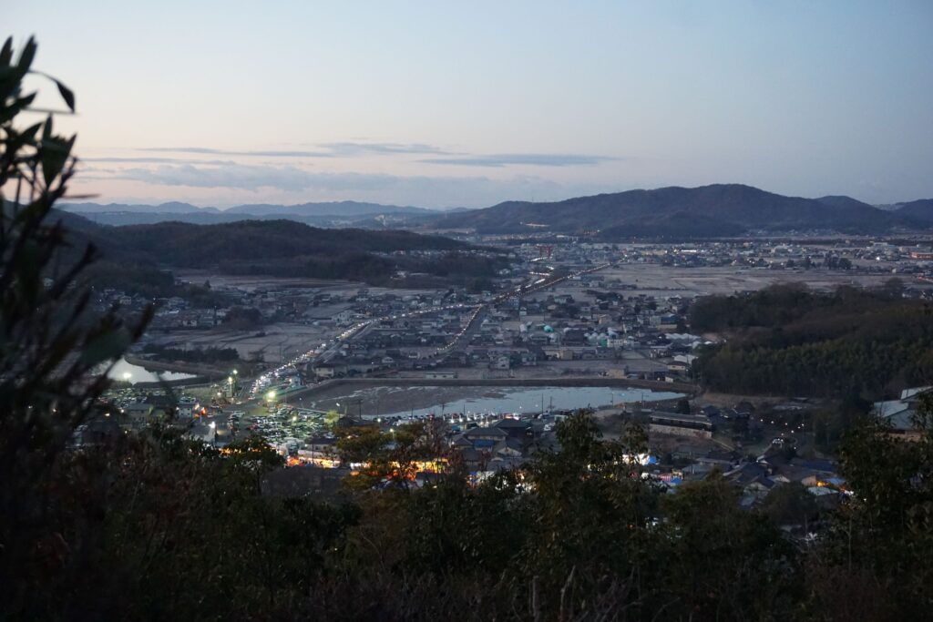 7時頃、日蓮聖人像が立つ見晴らしの良い秀吉本陣(一の丸)からは、最上稲荷を目指す車の行列と、備中高松駅から続く自転車道に灯された参拝者用の提灯の灯りがきれいに並んで見えます。ここは初日の出を拝むのに絶好のスポットとあって、辺りにはカメラを手に記念写真を撮ろうとする人々の笑顔がこぼれました。