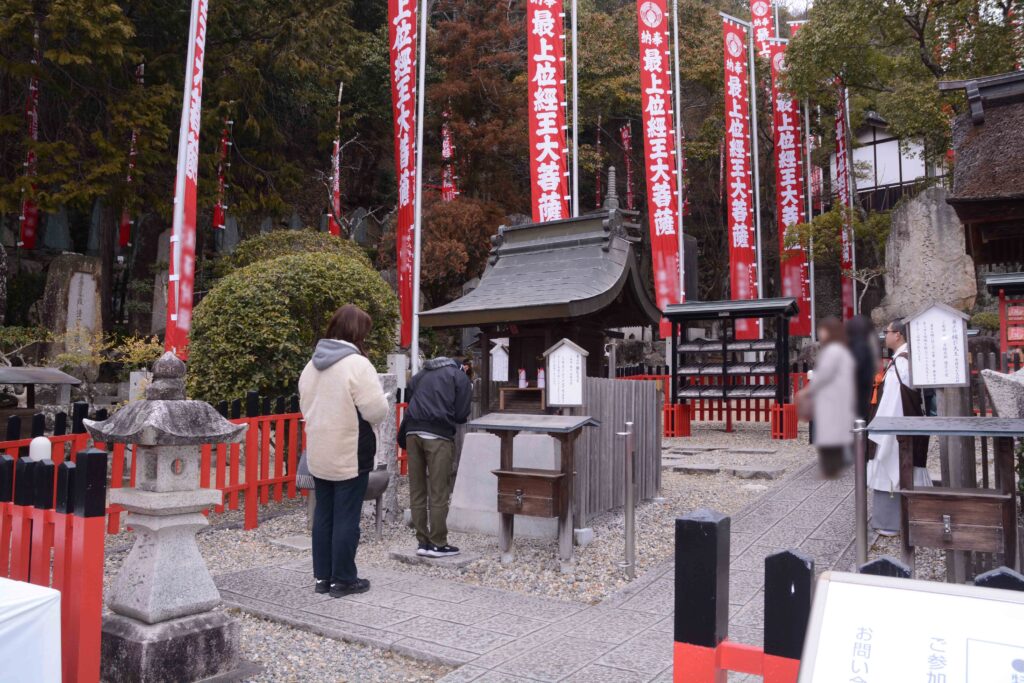 午前11時、1組目のお参りがスタート。偶数月の今月は、離別天王さまの前でお浄めが行われた後、僧侶の案内により離別さま、縁引さまの順に正式参拝の作法を教わりました。