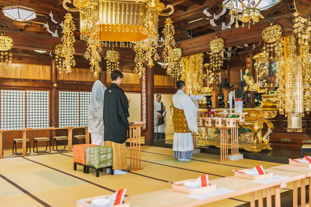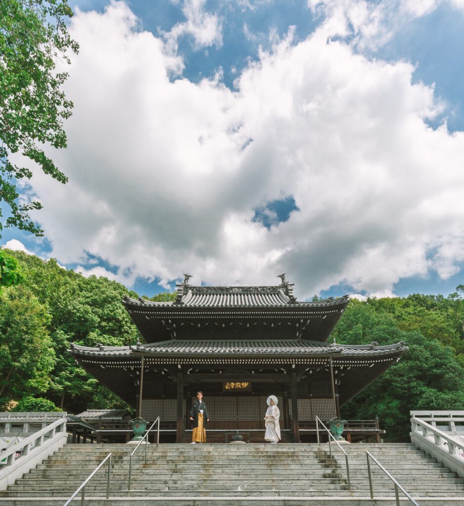 1200余年の歴史が息づく最上稲荷山妙教寺の根本大堂で、1日1組限定の厳かな挙式を。日本三大稲荷の荘厳な空気がふたりを祝福し、参列者の心にも深く刻まれるひとときをお約束します。