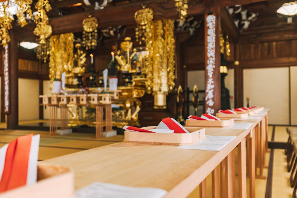 挙式後は境内の宿坊「顕妙閣」でゆったりと会席料理をお楽しみください。落ち着いた和の空間で、ご親族との語らいの時間を。