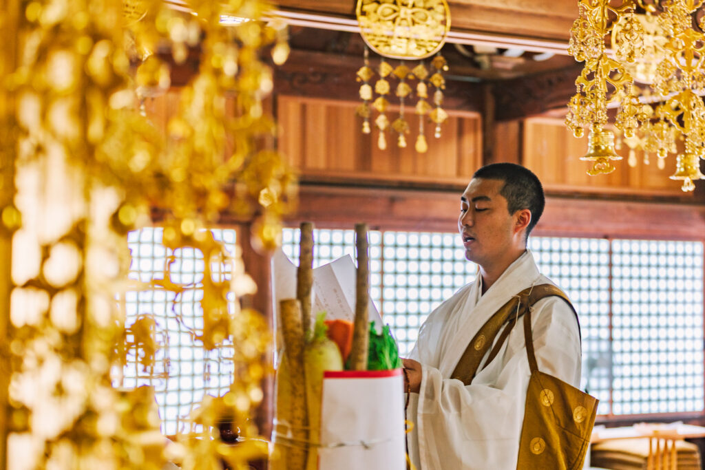 歴史ある妙教寺本堂(根本大堂)で、僧侶が心を込めて、厳かに儀式を執り行います。